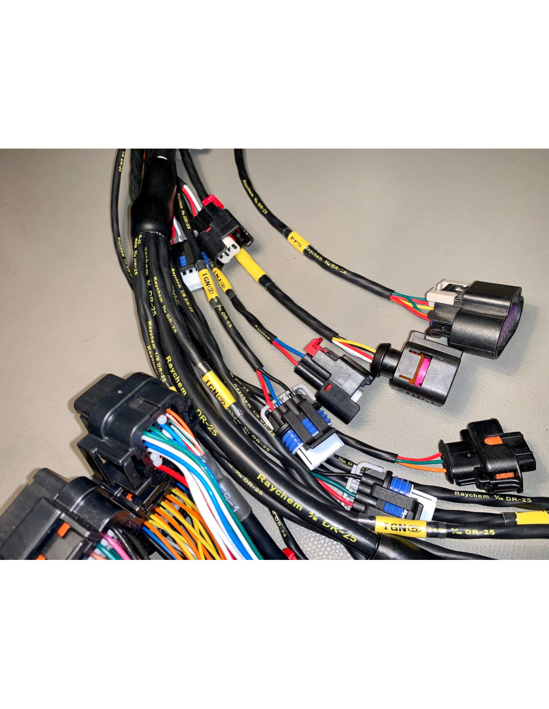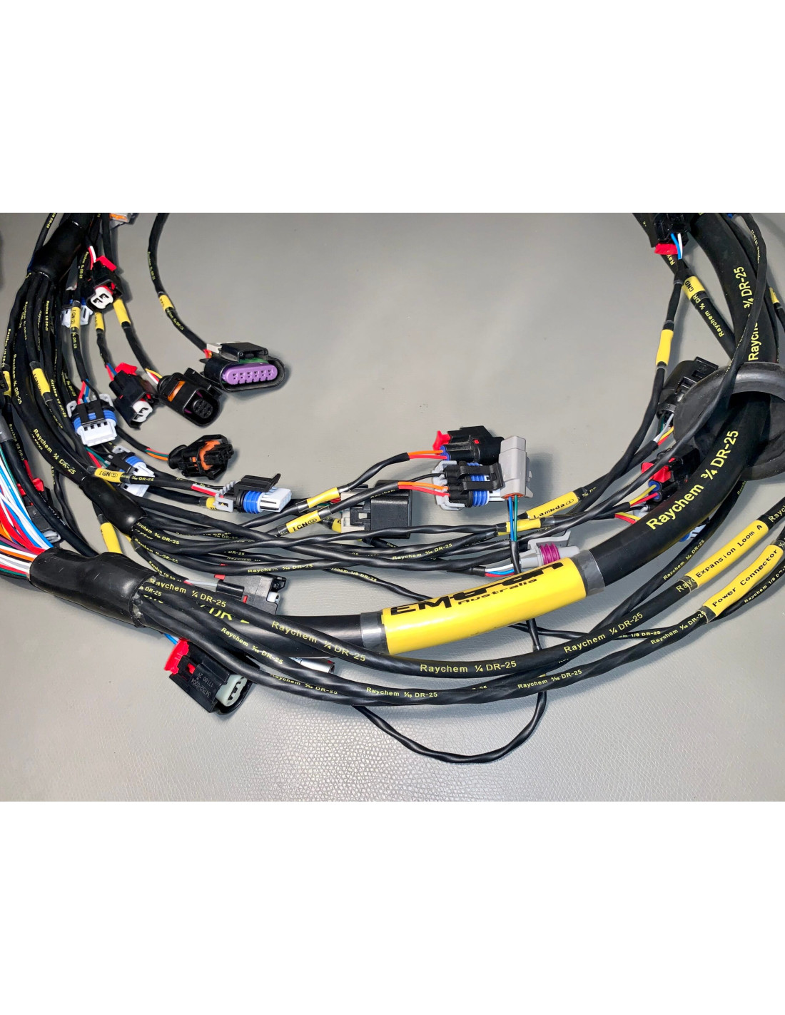 The harness is covered in DR25  tubing which is a diesel and heat resistant tubing.  These are used in vehicles where corrosive fuels are used. The Raychem DR25- tubing is known to be effectively used in military vehicles as it helps protect wiring harnesses from the potential damage that can be caused by abrasive oils and fuels.