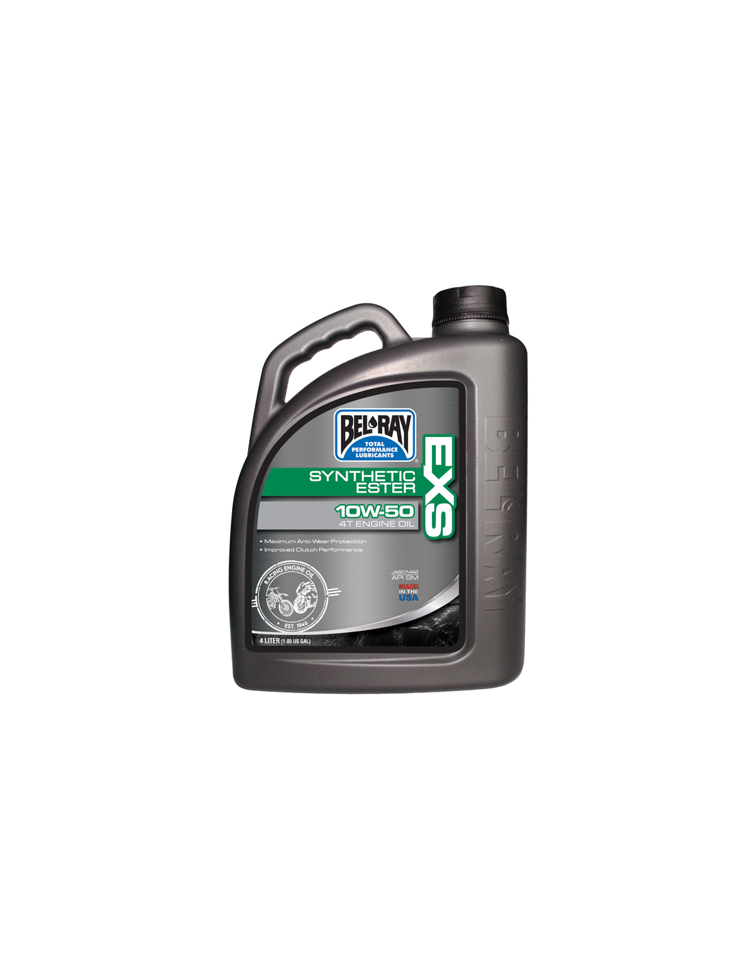 BelRay EXS Synthetic Ester 4T motorolja är en full syntetisk motorolja för 4-taktsmotorer. Oljan rekommenderas för alla touring, sport och racing 4-taktsmotorer. EXS Synthetic Ester 4T motorolja överstiger prestandakraven i API SM och JASO MA2. Oljan är lämplig för luftkylda eller vätskekylda 4-taktsmotorer och våta kopplingar. För användning i alla 4-taktsmotorer som kräver en olja som uppfyller API SG/SH/SJ/SL/SM standarder. För användning i alla 4-takts motorcyklar med eller utan våta kopplingar inklusive de specificerar användningen av en JASO MA/MA2 kvalificerad olja.
